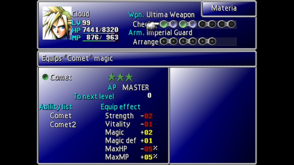 • This system envisions materia as magic gems that can either be attached to a person’s body to be used as a wand, or attached to equipment to grant it an effect (the choices are mutually exclusive).