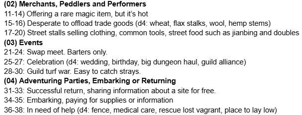 - Encounters: For when you spend an entire session in town and the players go looking for trouble.