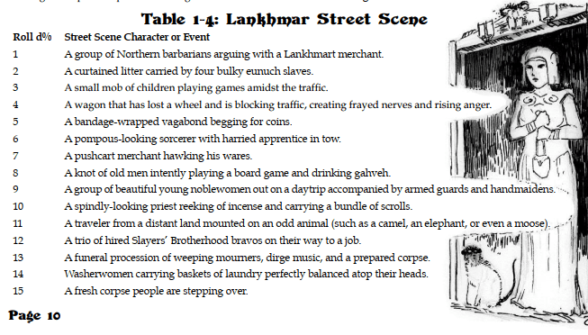 I don’t know if this is just personal problem or what, but one of my big beefs with setting books, including city books, is how I have to search to find street-level descriptions of what the players see, hear, smell, etc. One of the better examples I’ve seen of this recently is in the Lankhmar city book that comes in the DCC boxed set, which has lists of “street scenes” you can roll on: